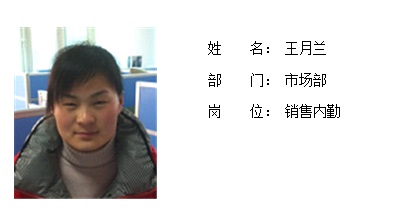 王月蘭同志至進入公司以來一直任勞任怨,工作作風認真踏實,協(xié)調(diào)公司各個部門配合市場銷售人員的工作,是市場部最可靠的后備保障。