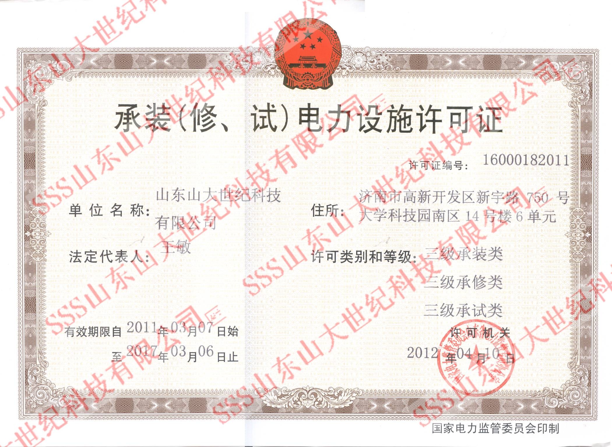 4月12日,山東省電監(jiān)辦資質(zhì)處正式向我公司頒發(fā)了三級承裝(修、試)電力設(shè)施許可證。