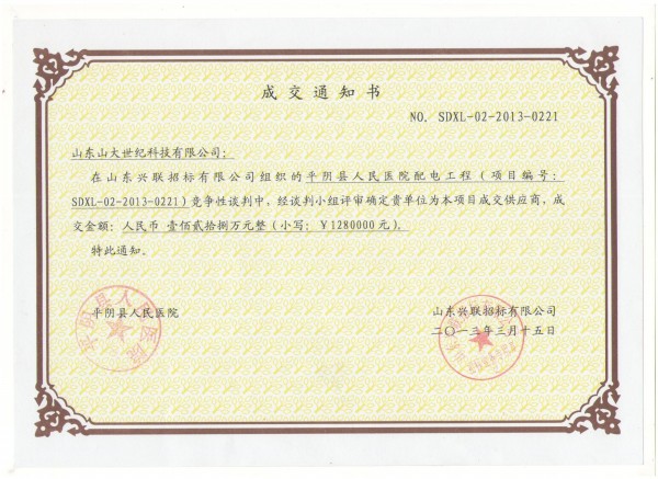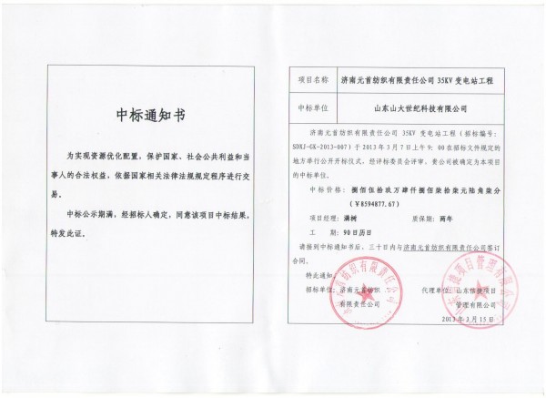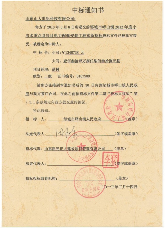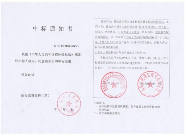 承裝項(xiàng)目2013年一季度中標(biāo)通知書