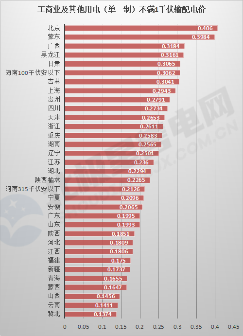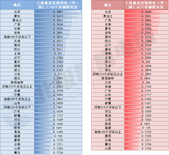 工商業(yè)及其他用電(單一制)1千伏輸配電價(jià)從高到低看,排在前五位的省份分別是:北京、蒙東、廣西、黑龍江、甘肅,北京最高為0.406元/千瓦時(shí)。排在后五位的分別是冀北、云南、山西、蒙西、青海,其中冀北最低為0.1374元/千瓦時(shí)??傮w來(lái)看,全國(guó)工商業(yè)及其他用電(單一制)1千伏輸配電價(jià)平均水平為0.2393元/千瓦時(shí),15個(gè)地區(qū)高于此水平(河北分為冀北和河北南部電網(wǎng)),18個(gè)地區(qū)低于此水平。如下所示:工商業(yè)及其他用電(單一制)1-10千伏輸配電價(jià)最高的依然為北京,0.3891元/千瓦時(shí),最低的為冀北0.1224元/千瓦時(shí)。全國(guó)的平均水平為0.2183元/千瓦時(shí),有15個(gè)地區(qū)高于此水平。另外需要注意,河南和海南的工商業(yè)及其他用電(單一制)1-10千伏輸配電價(jià)又分了不同標(biāo)準(zhǔn)。河南以315千伏安為界限,河南315千伏安以下的單一制1-10千伏輸配電價(jià)為0.1851元/千瓦時(shí);315千伏安及以上的為0.2052元/千瓦時(shí)。海南則以100千伏安為界限,海南100千伏安以下0.2831元/千瓦時(shí),100千伏安以上0.1867元/千瓦時(shí)。工商業(yè)及其他用電(單一制)35千伏輸配電價(jià)最低的為山西0.1106元/千瓦時(shí),最高為北京0.3649元/千瓦時(shí)。平均水平為0.195元/千瓦時(shí)。同樣河南和海南依然按電壓等級(jí)分為兩個(gè)電價(jià)水平。